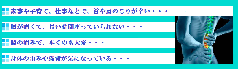 腰痛・脚の痛み・自律神経失調症・不安障害(パニック障害など)・ぎっくり腰・肩こり・頭痛・坐骨神経痛などのつらい症状、O脚・骨盤のゆがみ・猫背でお悩みの方は・・・